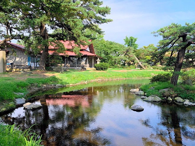The space opens up to grasses, mosses, and short magnolia trees. A small grassy knoll. Patches of hydrangea and chrysanthemum grow in clumps in a manicured yet natural way.